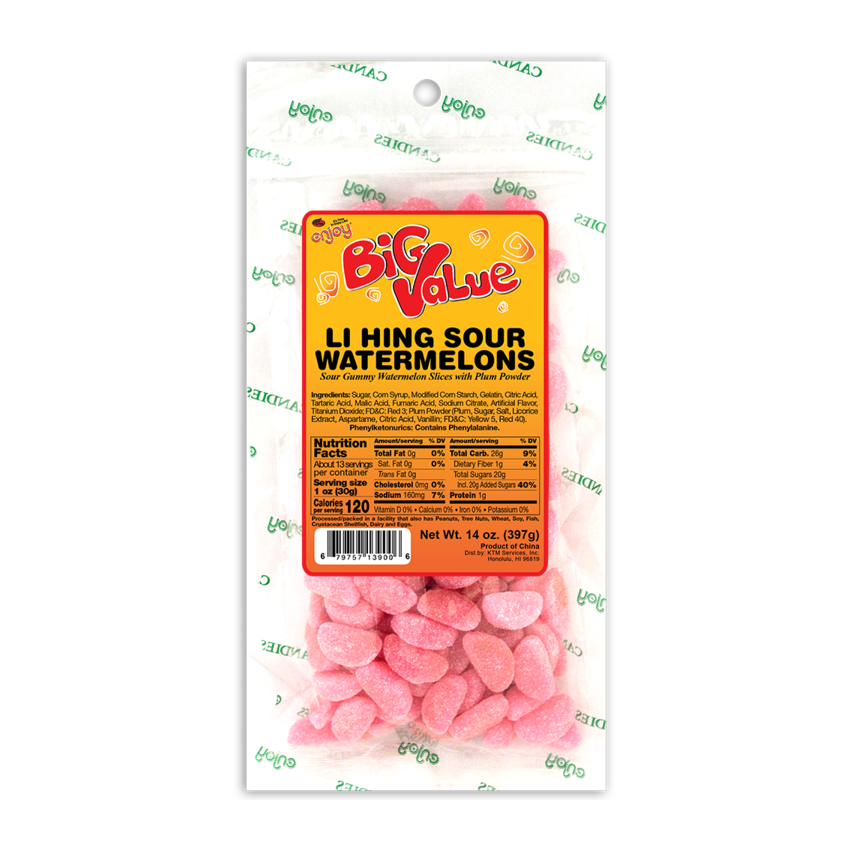 Our Big Value Li Hing Sour Watermelon comes in large 14oz resealable packages. Colored and shaped like little watermelon wedges, they are sour, watermelon-flavored gummies dusted with plum powder and sugar for a sweet and tart flavor.